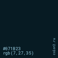 Цвет #071B23 в цветовой модели RGB обозначается тремя октетами (7, 27, 35) в десятичном формате и #071B23 в шестнадцатиричном (hex) формате, которые являются интенсивностью красного 7 (hex 07), интенсивность зелёного 27 (hex 1B) и интенсивность синего 35 (hex 23).