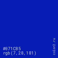 Цвет #071CB5 в цветовой модели RGB обозначается тремя октетами (7, 28, 181) в десятичном формате и #071CB5 в шестнадцатиричном (hex) формате, которые являются интенсивностью красного 7 (hex 07), интенсивность зелёного 28 (hex 1C) и интенсивность синего 181 (hex B5).