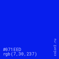 Цвет #071EED в цветовой модели RGB обозначается тремя октетами (7, 30, 237) в десятичном формате и #071EED в шестнадцатиричном (hex) формате, которые являются интенсивностью красного 7 (hex 07), интенсивность зелёного 30 (hex 1E) и интенсивность синего 237 (hex ED).