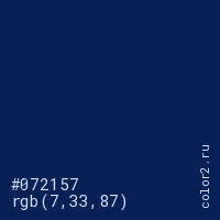 Цвет #072157 в цветовой модели RGB обозначается тремя октетами (7, 33, 87) в десятичном формате и #072157 в шестнадцатиричном (hex) формате, которые являются интенсивностью красного 7 (hex 07), интенсивность зелёного 33 (hex 21) и интенсивность синего 87 (hex 57).