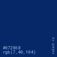 Цвет #072868 в цветовой модели RGB обозначается тремя октетами (7, 40, 104) в десятичном формате и #072868 в шестнадцатиричном (hex) формате, которые являются интенсивностью красного 7 (hex 07), интенсивность зелёного 40 (hex 28) и интенсивность синего 104 (hex 68).