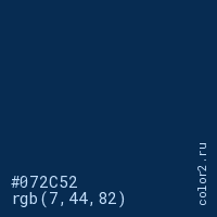 Цвет #072C52 в цветовой модели RGB обозначается тремя октетами (7, 44, 82) в десятичном формате и #072C52 в шестнадцатиричном (hex) формате, которые являются интенсивностью красного 7 (hex 07), интенсивность зелёного 44 (hex 2C) и интенсивность синего 82 (hex 52).