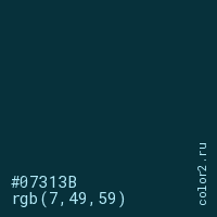 Цвет #07313B в цветовой модели RGB обозначается тремя октетами (7, 49, 59) в десятичном формате и #07313B в шестнадцатиричном (hex) формате, которые являются интенсивностью красного 7 (hex 07), интенсивность зелёного 49 (hex 31) и интенсивность синего 59 (hex 3B).