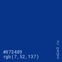 Цвет #073489 в цветовой модели RGB обозначается тремя октетами (7, 52, 137) в десятичном формате и #073489 в шестнадцатиричном (hex) формате, которые являются интенсивностью красного 7 (hex 07), интенсивность зелёного 52 (hex 34) и интенсивность синего 137 (hex 89).