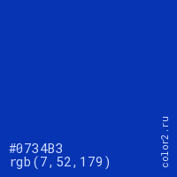 Цвет #0734B3 в цветовой модели RGB обозначается тремя октетами (7, 52, 179) в десятичном формате и #0734B3 в шестнадцатиричном (hex) формате, которые являются интенсивностью красного 7 (hex 07), интенсивность зелёного 52 (hex 34) и интенсивность синего 179 (hex B3).