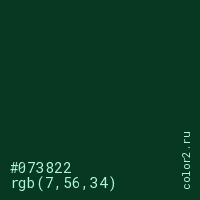 Цвет #073822 в цветовой модели RGB обозначается тремя октетами (7, 56, 34) в десятичном формате и #073822 в шестнадцатиричном (hex) формате, которые являются интенсивностью красного 7 (hex 07), интенсивность зелёного 56 (hex 38) и интенсивность синего 34 (hex 22).