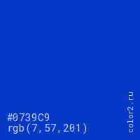 Цвет #0739C9 в цветовой модели RGB обозначается тремя октетами (7, 57, 201) в десятичном формате и #0739C9 в шестнадцатиричном (hex) формате, которые являются интенсивностью красного 7 (hex 07), интенсивность зелёного 57 (hex 39) и интенсивность синего 201 (hex C9).