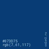 Цвет #073D75 в цветовой модели RGB обозначается тремя октетами (7, 61, 117) в десятичном формате и #073D75 в шестнадцатиричном (hex) формате, которые являются интенсивностью красного 7 (hex 07), интенсивность зелёного 61 (hex 3D) и интенсивность синего 117 (hex 75).
