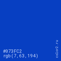 Цвет #073FC2 в цветовой модели RGB обозначается тремя октетами (7, 63, 194) в десятичном формате и #073FC2 в шестнадцатиричном (hex) формате, которые являются интенсивностью красного 7 (hex 07), интенсивность зелёного 63 (hex 3F) и интенсивность синего 194 (hex C2).