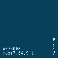 Цвет #07405B в цветовой модели RGB обозначается тремя октетами (7, 64, 91) в десятичном формате и #07405B в шестнадцатиричном (hex) формате, которые являются интенсивностью красного 7 (hex 07), интенсивность зелёного 64 (hex 40) и интенсивность синего 91 (hex 5B).