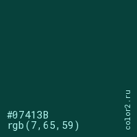 Цвет #07413B в цветовой модели RGB обозначается тремя октетами (7, 65, 59) в десятичном формате и #07413B в шестнадцатиричном (hex) формате, которые являются интенсивностью красного 7 (hex 07), интенсивность зелёного 65 (hex 41) и интенсивность синего 59 (hex 3B).