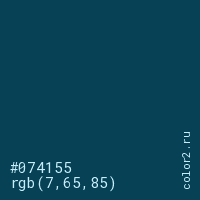 Цвет #074155 в цветовой модели RGB обозначается тремя октетами (7, 65, 85) в десятичном формате и #074155 в шестнадцатиричном (hex) формате, которые являются интенсивностью красного 7 (hex 07), интенсивность зелёного 65 (hex 41) и интенсивность синего 85 (hex 55).