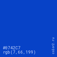 Цвет #0742C7 в цветовой модели RGB обозначается тремя октетами (7, 66, 199) в десятичном формате и #0742C7 в шестнадцатиричном (hex) формате, которые являются интенсивностью красного 7 (hex 07), интенсивность зелёного 66 (hex 42) и интенсивность синего 199 (hex C7).