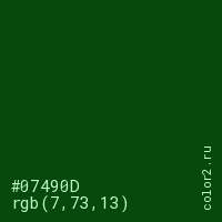 Цвет #07490D в цветовой модели RGB обозначается тремя октетами (7, 73, 13) в десятичном формате и #07490D в шестнадцатиричном (hex) формате, которые являются интенсивностью красного 7 (hex 07), интенсивность зелёного 73 (hex 49) и интенсивность синего 13 (hex 0D).