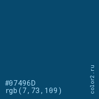 Цвет #07496D в цветовой модели RGB обозначается тремя октетами (7, 73, 109) в десятичном формате и #07496D в шестнадцатиричном (hex) формате, которые являются интенсивностью красного 7 (hex 07), интенсивность зелёного 73 (hex 49) и интенсивность синего 109 (hex 6D).