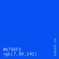 Цвет #0750F2 в цветовой модели RGB обозначается тремя октетами (7, 80, 242) в десятичном формате и #0750F2 в шестнадцатиричном (hex) формате, которые являются интенсивностью красного 7 (hex 07), интенсивность зелёного 80 (hex 50) и интенсивность синего 242 (hex F2).