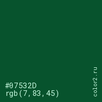 Цвет #07532D в цветовой модели RGB обозначается тремя октетами (7, 83, 45) в десятичном формате и #07532D в шестнадцатиричном (hex) формате, которые являются интенсивностью красного 7 (hex 07), интенсивность зелёного 83 (hex 53) и интенсивность синего 45 (hex 2D).