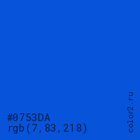 Цвет #0753DA в цветовой модели RGB обозначается тремя октетами (7, 83, 218) в десятичном формате и #0753DA в шестнадцатиричном (hex) формате, которые являются интенсивностью красного 7 (hex 07), интенсивность зелёного 83 (hex 53) и интенсивность синего 218 (hex DA).