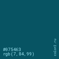 Цвет #075463 в цветовой модели RGB обозначается тремя октетами (7, 84, 99) в десятичном формате и #075463 в шестнадцатиричном (hex) формате, которые являются интенсивностью красного 7 (hex 07), интенсивность зелёного 84 (hex 54) и интенсивность синего 99 (hex 63).