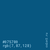 Цвет #075780 в цветовой модели RGB обозначается тремя октетами (7, 87, 128) в десятичном формате и #075780 в шестнадцатиричном (hex) формате, которые являются интенсивностью красного 7 (hex 07), интенсивность зелёного 87 (hex 57) и интенсивность синего 128 (hex 80).