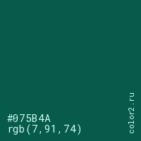 Цвет #075B4A в цветовой модели RGB обозначается тремя октетами (7, 91, 74) в десятичном формате и #075B4A в шестнадцатиричном (hex) формате, которые являются интенсивностью красного 7 (hex 07), интенсивность зелёного 91 (hex 5B) и интенсивность синего 74 (hex 4A).