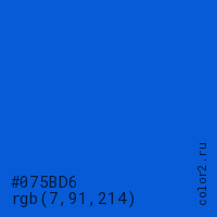 Цвет #075BD6 в цветовой модели RGB обозначается тремя октетами (7, 91, 214) в десятичном формате и #075BD6 в шестнадцатиричном (hex) формате, которые являются интенсивностью красного 7 (hex 07), интенсивность зелёного 91 (hex 5B) и интенсивность синего 214 (hex D6).