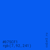 Цвет #075CF1 в цветовой модели RGB обозначается тремя октетами (7, 92, 241) в десятичном формате и #075CF1 в шестнадцатиричном (hex) формате, которые являются интенсивностью красного 7 (hex 07), интенсивность зелёного 92 (hex 5C) и интенсивность синего 241 (hex F1).