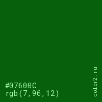 Цвет #07600C в цветовой модели RGB обозначается тремя октетами (7, 96, 12) в десятичном формате и #07600C в шестнадцатиричном (hex) формате, которые являются интенсивностью красного 7 (hex 07), интенсивность зелёного 96 (hex 60) и интенсивность синего 12 (hex 0C).