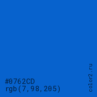 Цвет #0762CD в цветовой модели RGB обозначается тремя октетами (7, 98, 205) в десятичном формате и #0762CD в шестнадцатиричном (hex) формате, которые являются интенсивностью красного 7 (hex 07), интенсивность зелёного 98 (hex 62) и интенсивность синего 205 (hex CD).