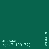 Цвет #07644D в цветовой модели RGB обозначается тремя октетами (7, 100, 77) в десятичном формате и #07644D в шестнадцатиричном (hex) формате, которые являются интенсивностью красного 7 (hex 07), интенсивность зелёного 100 (hex 64) и интенсивность синего 77 (hex 4D).
