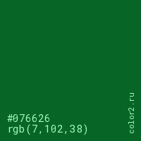 Цвет #076626 в цветовой модели RGB обозначается тремя октетами (7, 102, 38) в десятичном формате и #076626 в шестнадцатиричном (hex) формате, которые являются интенсивностью красного 7 (hex 07), интенсивность зелёного 102 (hex 66) и интенсивность синего 38 (hex 26).