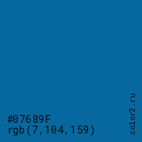 Цвет #07689F в цветовой модели RGB обозначается тремя октетами (7, 104, 159) в десятичном формате и #07689F в шестнадцатиричном (hex) формате, которые являются интенсивностью красного 7 (hex 07), интенсивность зелёного 104 (hex 68) и интенсивность синего 159 (hex 9F).