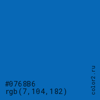 Цвет #0768B6 в цветовой модели RGB обозначается тремя октетами (7, 104, 182) в десятичном формате и #0768B6 в шестнадцатиричном (hex) формате, которые являются интенсивностью красного 7 (hex 07), интенсивность зелёного 104 (hex 68) и интенсивность синего 182 (hex B6).