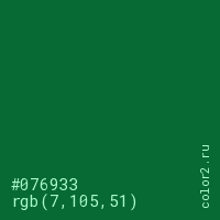 Цвет #076933 в цветовой модели RGB обозначается тремя октетами (7, 105, 51) в десятичном формате и #076933 в шестнадцатиричном (hex) формате, которые являются интенсивностью красного 7 (hex 07), интенсивность зелёного 105 (hex 69) и интенсивность синего 51 (hex 33).