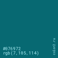 Цвет #076972 в цветовой модели RGB обозначается тремя октетами (7, 105, 114) в десятичном формате и #076972 в шестнадцатиричном (hex) формате, которые являются интенсивностью красного 7 (hex 07), интенсивность зелёного 105 (hex 69) и интенсивность синего 114 (hex 72).