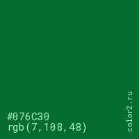 Цвет #076C30 в цветовой модели RGB обозначается тремя октетами (7, 108, 48) в десятичном формате и #076C30 в шестнадцатиричном (hex) формате, которые являются интенсивностью красного 7 (hex 07), интенсивность зелёного 108 (hex 6C) и интенсивность синего 48 (hex 30).