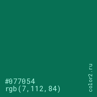 Цвет #077054 в цветовой модели RGB обозначается тремя октетами (7, 112, 84) в десятичном формате и #077054 в шестнадцатиричном (hex) формате, которые являются интенсивностью красного 7 (hex 07), интенсивность зелёного 112 (hex 70) и интенсивность синего 84 (hex 54).