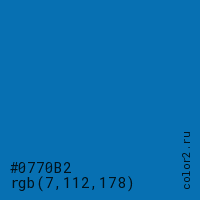 Цвет #0770B2 в цветовой модели RGB обозначается тремя октетами (7, 112, 178) в десятичном формате и #0770B2 в шестнадцатиричном (hex) формате, которые являются интенсивностью красного 7 (hex 07), интенсивность зелёного 112 (hex 70) и интенсивность синего 178 (hex B2).