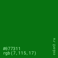 Цвет #077311 в цветовой модели RGB обозначается тремя октетами (7, 115, 17) в десятичном формате и #077311 в шестнадцатиричном (hex) формате, которые являются интенсивностью красного 7 (hex 07), интенсивность зелёного 115 (hex 73) и интенсивность синего 17 (hex 11).