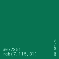 Цвет #077351 в цветовой модели RGB обозначается тремя октетами (7, 115, 81) в десятичном формате и #077351 в шестнадцатиричном (hex) формате, которые являются интенсивностью красного 7 (hex 07), интенсивность зелёного 115 (hex 73) и интенсивность синего 81 (hex 51).
