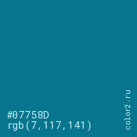 Цвет #07758D в цветовой модели RGB обозначается тремя октетами (7, 117, 141) в десятичном формате и #07758D в шестнадцатиричном (hex) формате, которые являются интенсивностью красного 7 (hex 07), интенсивность зелёного 117 (hex 75) и интенсивность синего 141 (hex 8D).