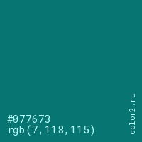 Цвет #077673 в цветовой модели RGB обозначается тремя октетами (7, 118, 115) в десятичном формате и #077673 в шестнадцатиричном (hex) формате, которые являются интенсивностью красного 7 (hex 07), интенсивность зелёного 118 (hex 76) и интенсивность синего 115 (hex 73).