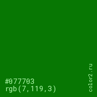 Цвет #077703 в цветовой модели RGB обозначается тремя октетами (7, 119, 3) в десятичном формате и #077703 в шестнадцатиричном (hex) формате, которые являются интенсивностью красного 7 (hex 07), интенсивность зелёного 119 (hex 77) и интенсивность синего 3 (hex 03).