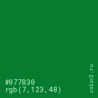 Цвет #077B30 в цветовой модели RGB обозначается тремя октетами (7, 123, 48) в десятичном формате и #077B30 в шестнадцатиричном (hex) формате, которые являются интенсивностью красного 7 (hex 07), интенсивность зелёного 123 (hex 7B) и интенсивность синего 48 (hex 30).