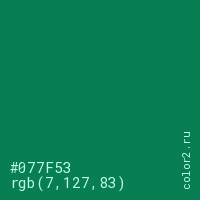 Цвет #077F53 в цветовой модели RGB обозначается тремя октетами (7, 127, 83) в десятичном формате и #077F53 в шестнадцатиричном (hex) формате, которые являются интенсивностью красного 7 (hex 07), интенсивность зелёного 127 (hex 7F) и интенсивность синего 83 (hex 53).