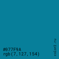 Цвет #077F9A в цветовой модели RGB обозначается тремя октетами (7, 127, 154) в десятичном формате и #077F9A в шестнадцатиричном (hex) формате, которые являются интенсивностью красного 7 (hex 07), интенсивность зелёного 127 (hex 7F) и интенсивность синего 154 (hex 9A).