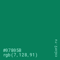 Цвет #07805B в цветовой модели RGB обозначается тремя октетами (7, 128, 91) в десятичном формате и #07805B в шестнадцатиричном (hex) формате, которые являются интенсивностью красного 7 (hex 07), интенсивность зелёного 128 (hex 80) и интенсивность синего 91 (hex 5B).