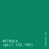 Цвет #078564 в цветовой модели RGB обозначается тремя октетами (7, 133, 100) в десятичном формате и #078564 в шестнадцатиричном (hex) формате, которые являются интенсивностью красного 7 (hex 07), интенсивность зелёного 133 (hex 85) и интенсивность синего 100 (hex 64).