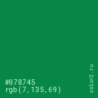 Цвет #078745 в цветовой модели RGB обозначается тремя октетами (7, 135, 69) в десятичном формате и #078745 в шестнадцатиричном (hex) формате, которые являются интенсивностью красного 7 (hex 07), интенсивность зелёного 135 (hex 87) и интенсивность синего 69 (hex 45).