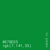 Цвет #078D35 в цветовой модели RGB обозначается тремя октетами (7, 141, 53) в десятичном формате и #078D35 в шестнадцатиричном (hex) формате, которые являются интенсивностью красного 7 (hex 07), интенсивность зелёного 141 (hex 8D) и интенсивность синего 53 (hex 35).
